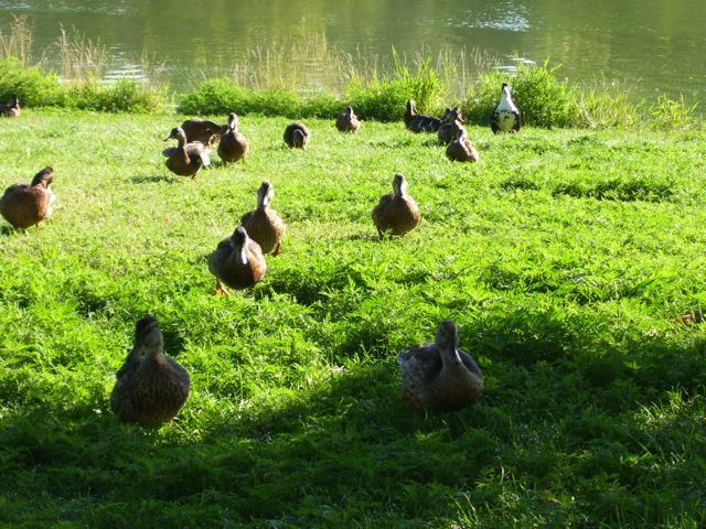 I walked over to a tree to take a picture of the ducks, but suddenly a bunch of ducks started to approach me. At first I was afraid that perhaps I was near a nest, and that they were going to attack me, but then I realized they were probably just hoping for some food.
