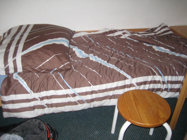 this is one of the beds in the hotel/retreat center. they have a very interesting way for bed coverings, for they are like sacks in which you put the pillows and comforter.