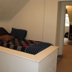 Row 2 (L-R): my bed (you can also see my office), a view from my office toward my bed and the stairs downstairs, once down the stairs you see my kitchen.