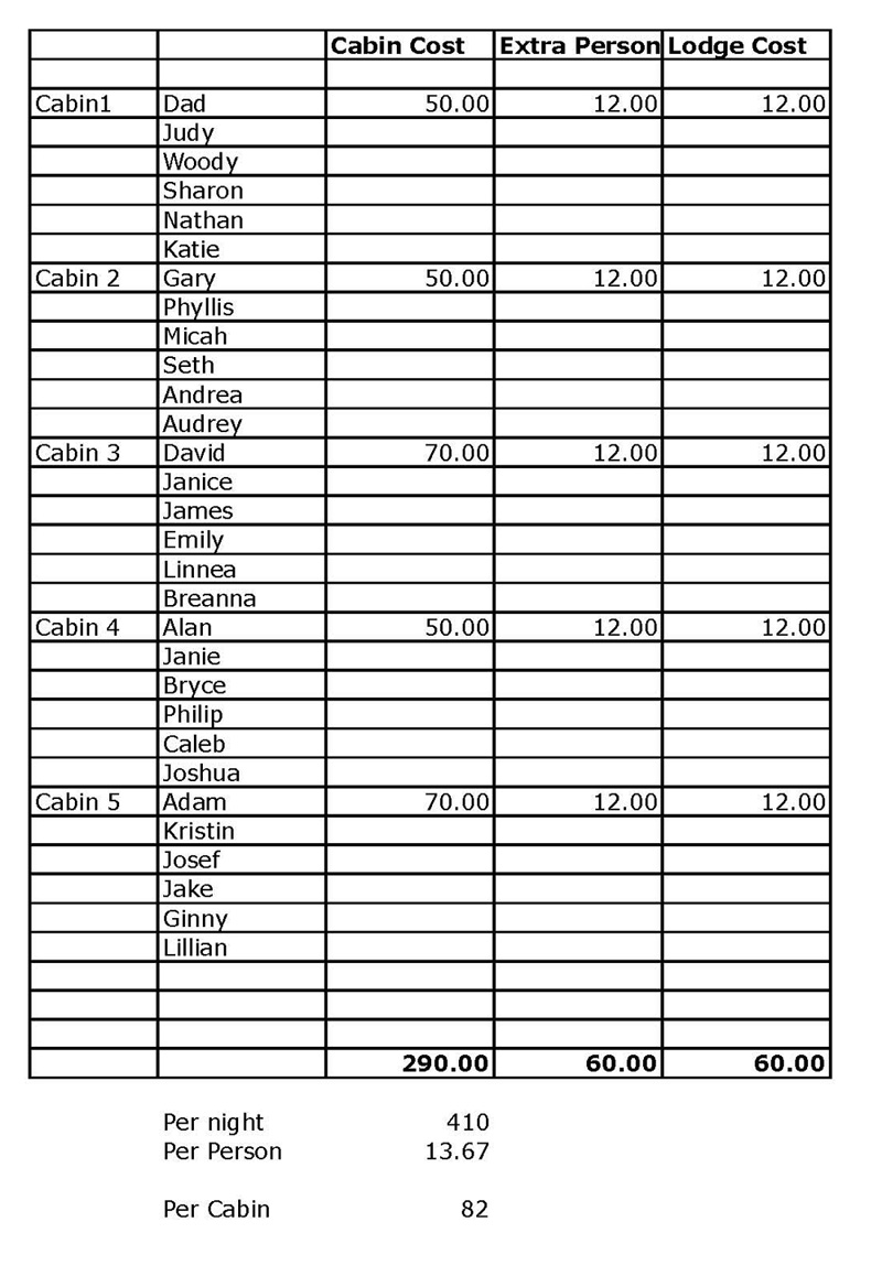 Judy suggested we look into Fairhaven Ministries as a place to have a family get together. It is located in Roan Mountain, TN. They give a special price to those involved in full time ministry. They have cottages and a central meeting place. You pay a per night fee for the cottage for two people and an additional 3 dollars a night for each additional person. There is also a per night fee for use of the meeting place–two dollars a person. Here are the costs for two scenarios (due to some unknowns) for the dates January 3-4, which are available.