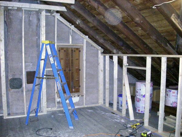 Well here is a picture. The plan is to have the walls under the sloping roof start at 5 feet from the floor, travel up the slope about 7 feet (or approximately 4.5 feet from the wall) where the ceiling will be flat at 8 feet above the floor for 5 feet and down the other side of the roof with the same dimensions. The room will have two windows and one one side a half door to storage area (or secrete compartment if you wish). Hopefully I’ll find the time to finish framing by this weekend, then wiring, insulation, and then drywall.