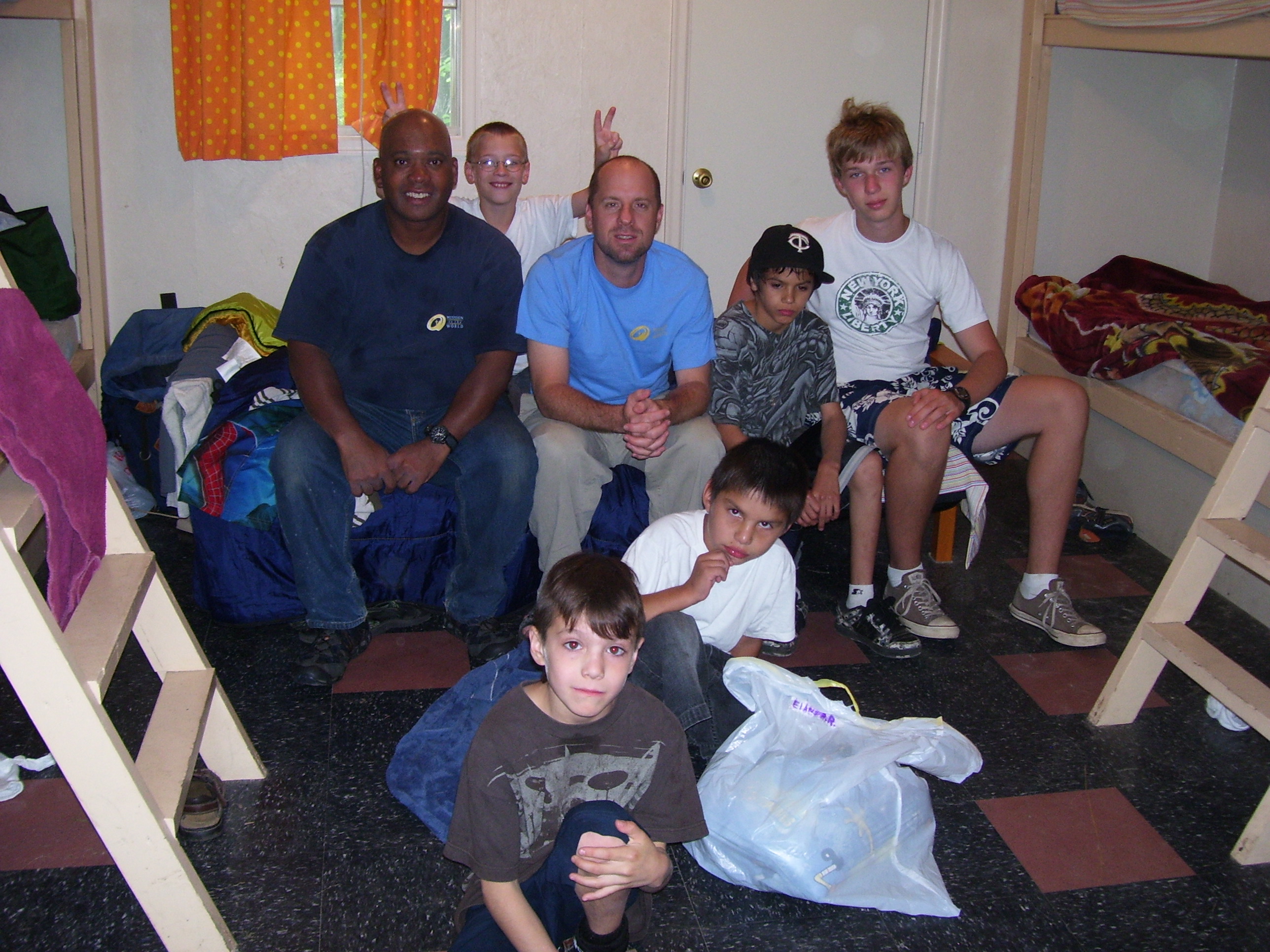 L-R: Ricky Webb, Jeremy Caldwell, Levi Tucker, Mark Tucker, Elanzo Roybal, Alex Caldwell, Geoff Winkleman. There was another boy, Rowan White, who was sent back home for repeatedly being disrespectful to the counselors and talking back to them. Alex is 11 years old, Jeremy 10, and Elanzo 8. Mark Tucker ( the guy in the light blue shirt is the associate pastor from Old Orchard. He brought his 9-year old son Levi with him ).
