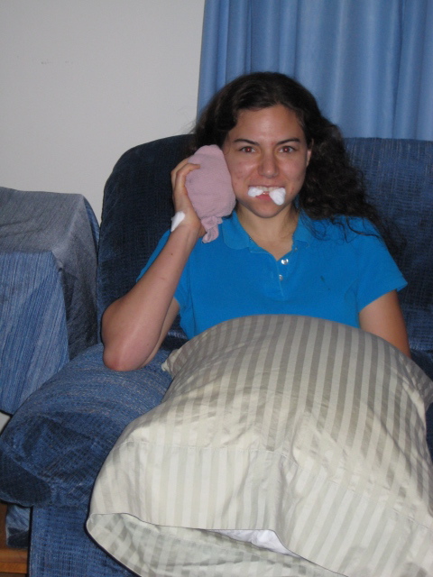 Dad and Andrea took me home, and for the rest of the evening I pretty much stayed on the couch watching TV, sipping water, eating ice cream and broth, and keeping ice on my swollen cheeks. It was hard to get stuff in my mouth, since most of it was numb. I’m sure it was very entertaining. Here is a picture of me that Andrea took soon after they brought me home. I was pretty awake!
