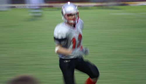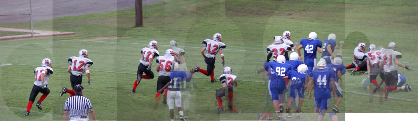 I think it’s a lot of fun to watch Philip play. It occured to me that he’s kind of like a cheetah running after its prey – fast, agile, deadly. Philip has an eye for where the prey is and will be and you can almost see the intesity of his attention on the prey. You can get an idea of this in a series of six, rapid-fire shots I took of Philip as he rushed into the end zone (from the ten-yard line) to catch a fumble and score a touch down. I strung all six pictures into one (you may have to click the image below to see the whole picture)…